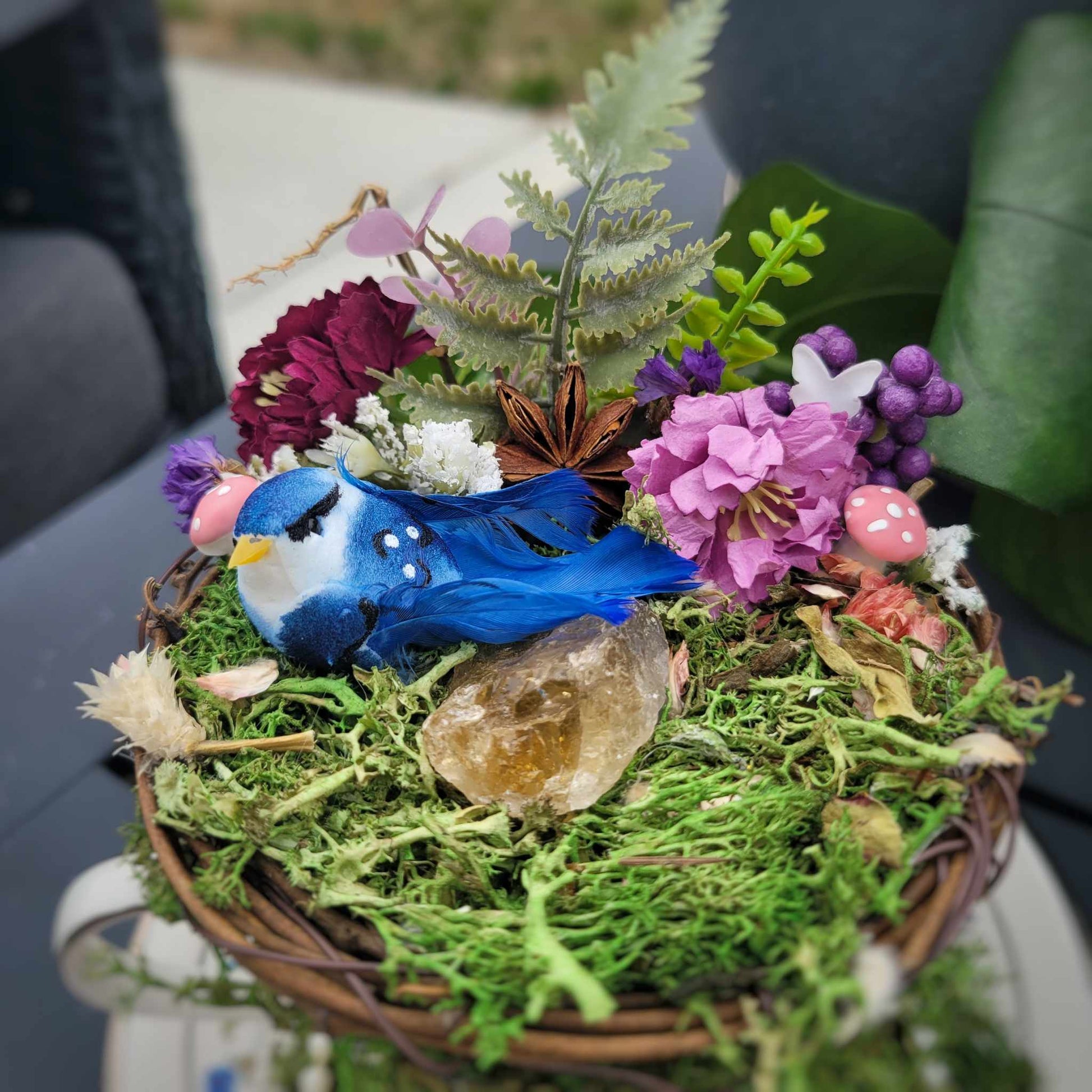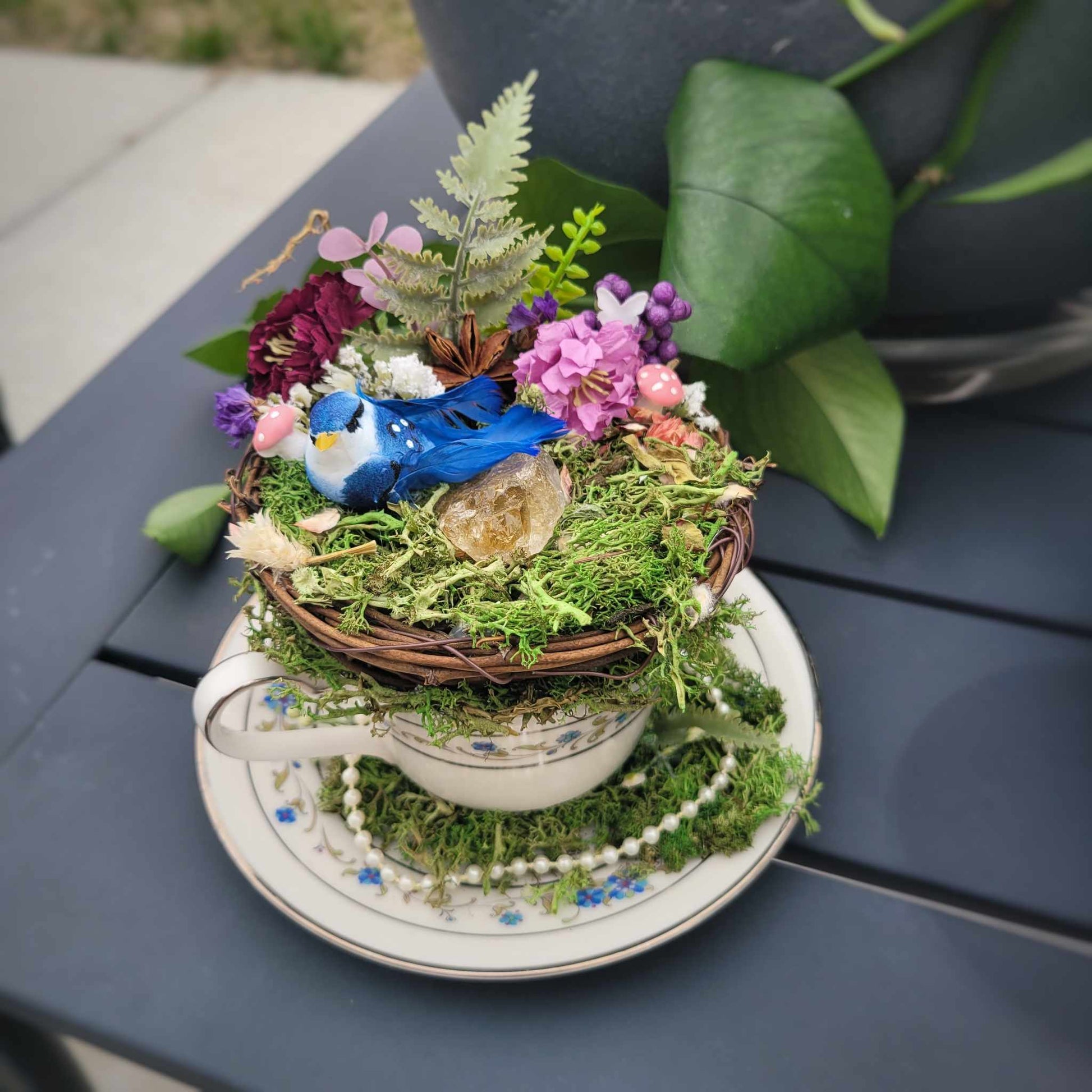 This vintage teacup boasts a charming aesthetic with its delicate moss and pearl embellishments, along with real and faux flowers and a dainty bird. Perfect for adding a touch of nature to any room.