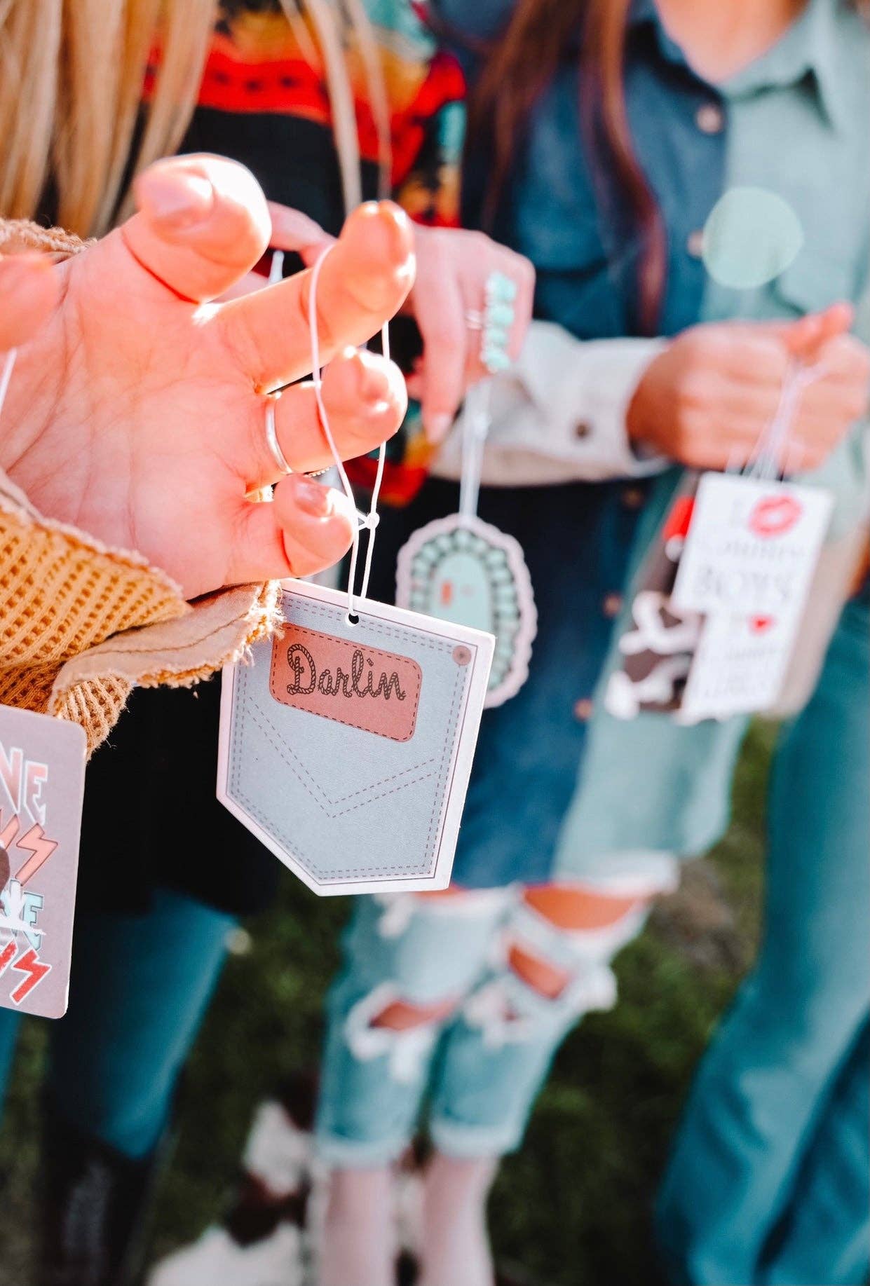 Darlin Air Freshener! Here is how we make our air fresheners: 1. Print the designs (Front side and back side): 2. Make cutting model and cut the custom shape: 3. Thread the rope: 4. Perfume the scent: 5. Pack the air fresheners in a plastic bag and seal: 6. Attach the bag to our branded card: 7. Pack & ship the air fresheners to you!